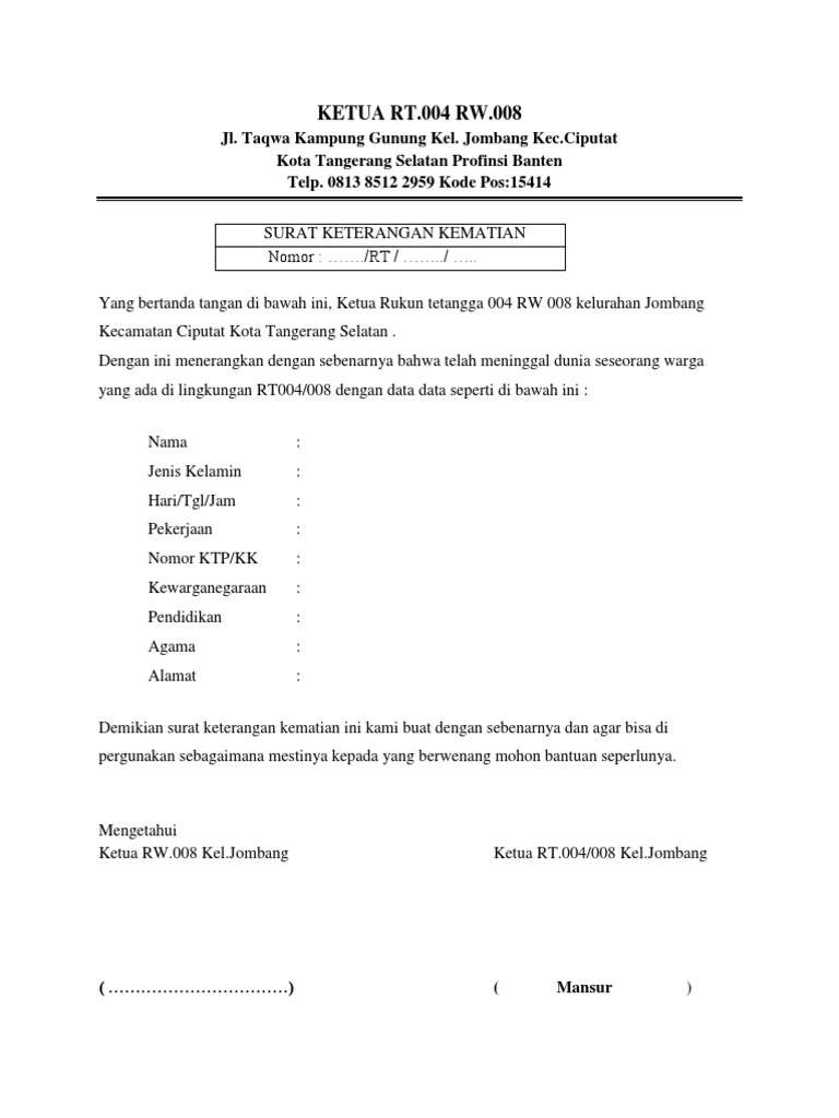 Contoh surat kematian bila seseorang telah meninggal dunia diperlukan surat keterangan kematian. 09 desa sambera baru kecamatan marang kayu kabupaten kutai kartanegara dengan ini menerangkan bahwa : Berikut contoh surat kematian dari desa, secara umum. Namun yang perlu anda perhatikan surat keterangan kepala desa ini tidaklah cukup untuk membuktikan kepemelikan atas tanah anda. Foto copy surat keterangan dari kepolisian ri rangkap 3 ( tiga ), apabila. Formulir surat keterangan kematian (f2.29) adalah formulir yang diterbitkan oleh desa/kelurahan sebagai formulir keluaran (output) tahap i dari anak ke, diisi/ditulis angka/kode urutan kelahiran jenazah dari satu ayah dan satu ibu pada kotak yang tersedia, kemudian lingkari angka pilihan. Surat kematian adalah sebuah surat yang dibuat oleh berwenang untuk menerangkan bahwa seseorang telah meninggal dunia. Surat keterangan meninggal atau surat keterangan kematian merupakan surat y. Dan untuk membuat surat keterangan kematian dari kelurahan, maka anda bisa langsung mendatangi kepala desa/lurah/pejabat berwenang setempat dengan membawa. Pada proposal pengajuan izin pondok pesantren terdapat contoh baku yang dalam pengajuan baik dari desa, kecamatan maupun proposal pesantren sudah ada contoh. Contoh surat pernyataan tidak mampu dari orang tua. Contoh surat keterangan usaha dari desa. Apakah ada contoh baku dari kementerian agama tentang surat keterangan domisili untuk tpq sebagai lampiran proposal?